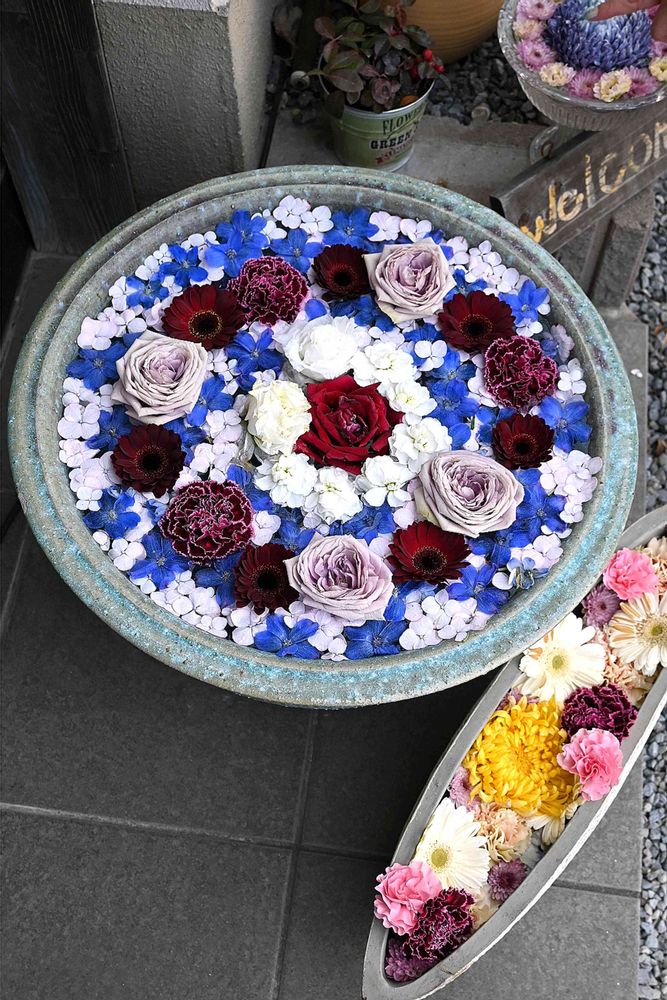③菓子工房オリーブの花手水、大輪のブルーの菊、グラデーションが大人っぽい😍💙