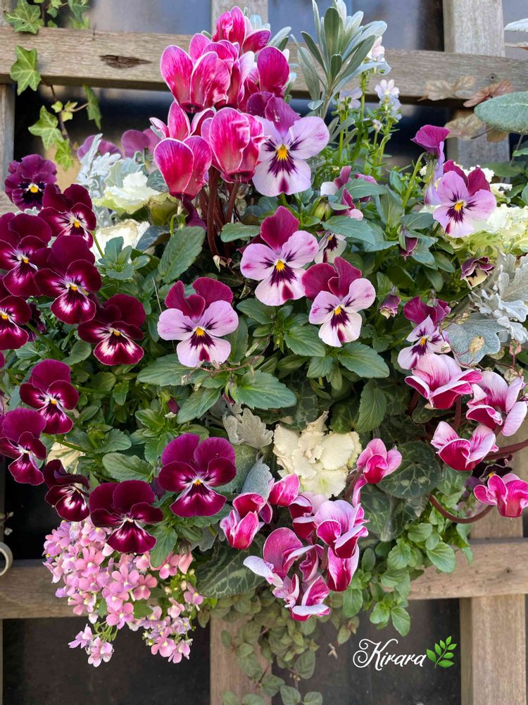 12月下旬に作ったガーデンシクラメンとビオラ達のハンギングバスケットがしっかり根付き花数も増えてきてます💐 乾燥していて小さいバスケットだから冬でもお水やりが欠かせません🚰