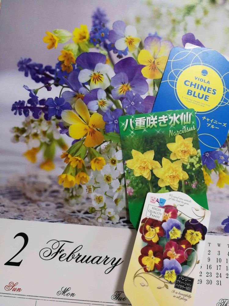 ④ビビッ💘と来た2月のカレンダーに、花苗のラベルを添えて♫