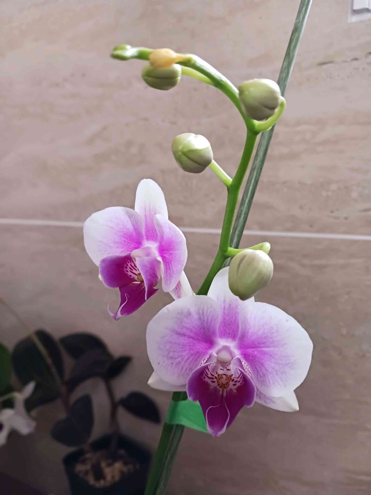 ②ミディ胡蝶蘭モニターでもらったコ(ほの華)よりも花紫色がもう少し多めのコです。大きさは比べてみて明らかに小さいわ😅😅