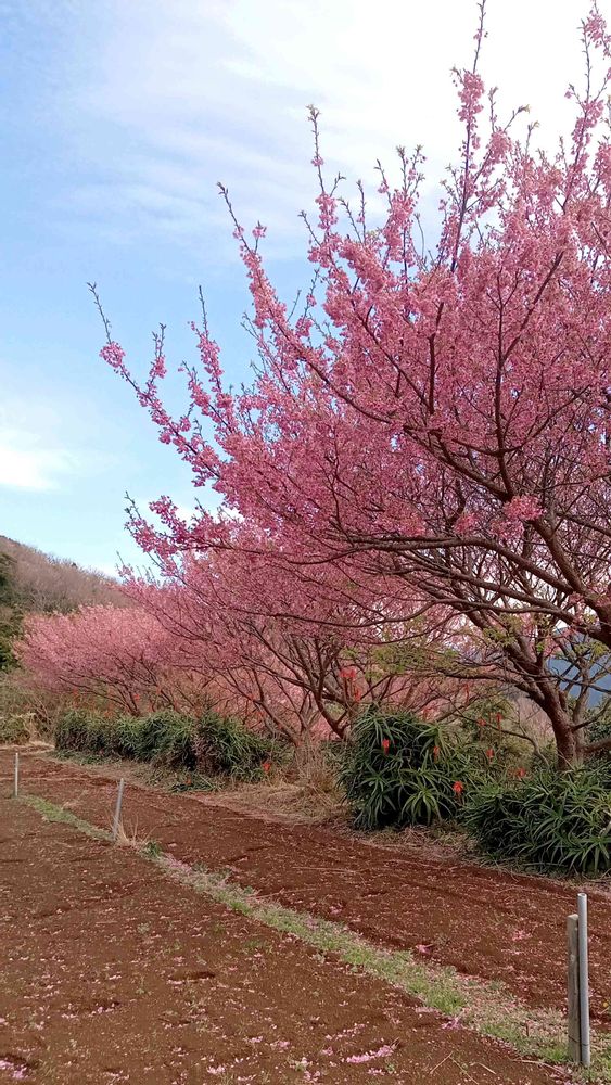 早咲きの濃いピンク色の花
