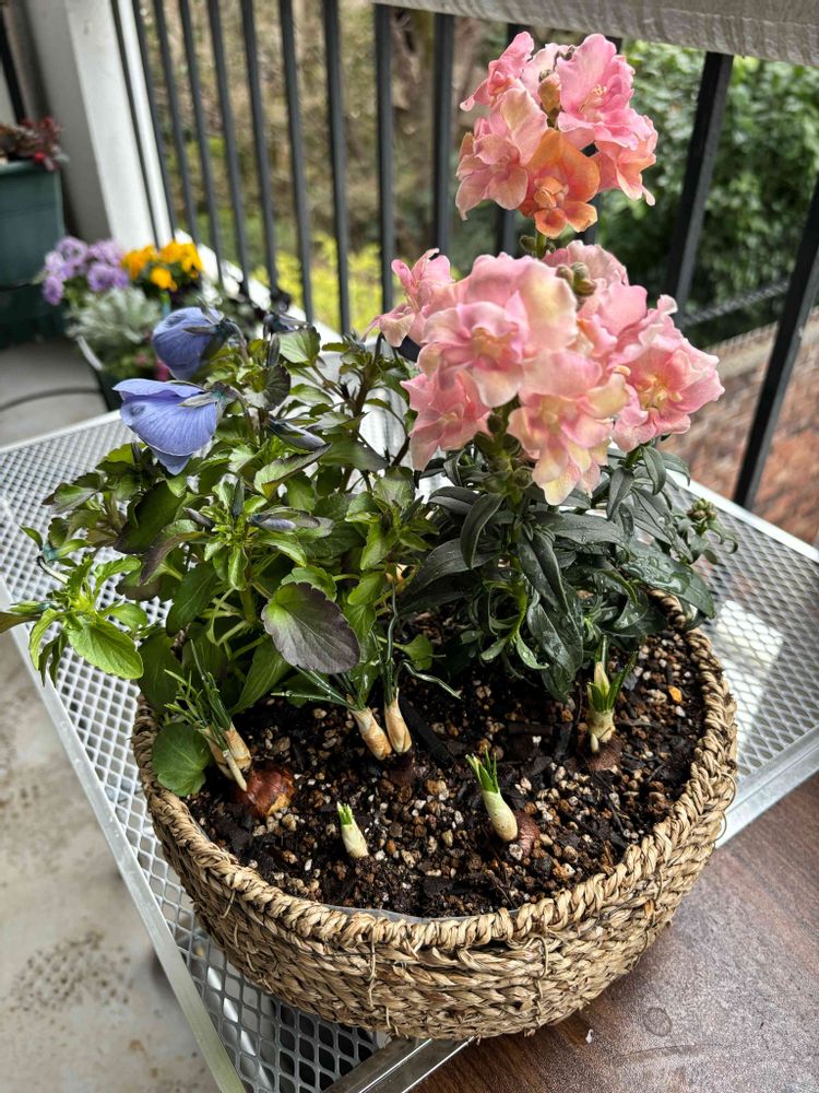 金魚草に一目惚れ。次は種から育てたい。スーパーで250円のビオラは鼠色がかった青で良き色。育てていたクロッカスと寄せ植え。