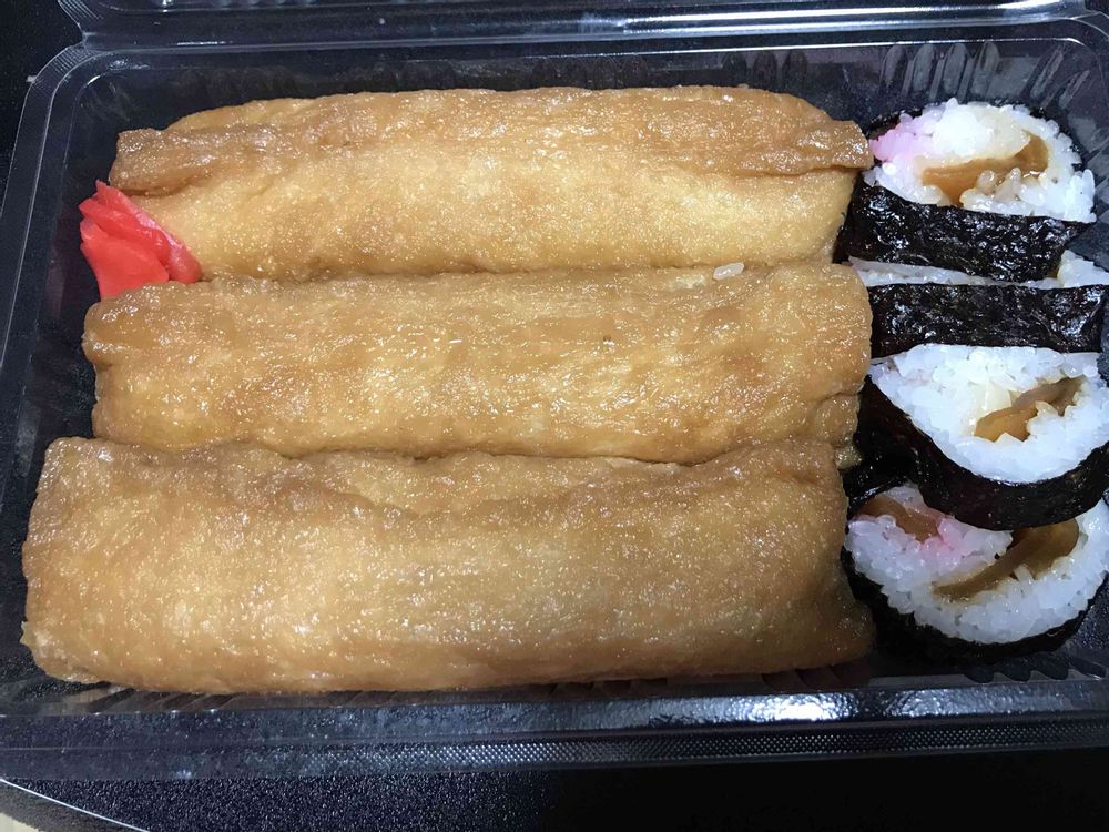 オマケに、こんなに食べられないから半分持って帰って、じゃあ食べてっちゃおうかなぁ。お稲荷2本を食べちゃいました。
