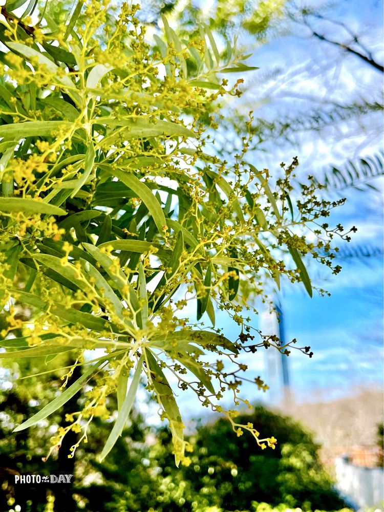 ギンヨウアカシア、ここはバラ園の上の方のオージーエリアです!ちょうど隙間からタワーが見える場所があるの😉✨
