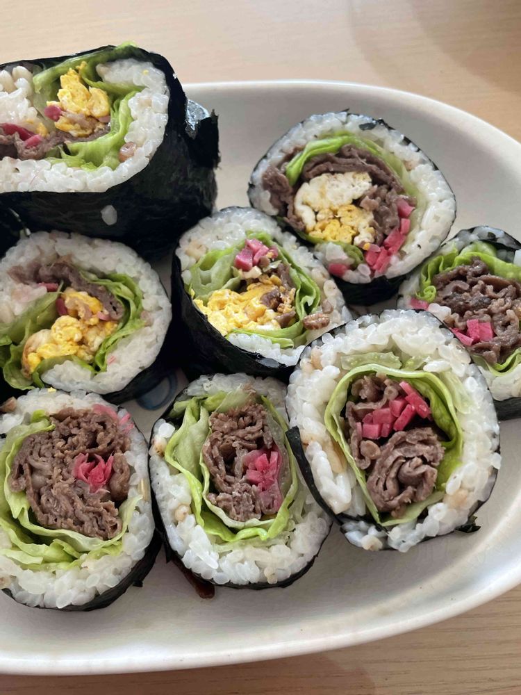 それから海苔巻作るつもりはなかったのですが、冷蔵庫にあるもので夕飯作っちゃえ〜と思ったら牛肉🥩とレタス🥬と生卵🥚が一個しかなかったんです。