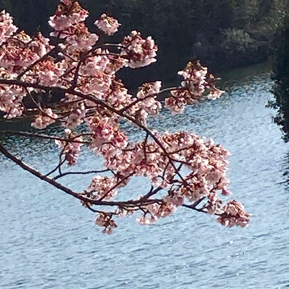 風が少しあり、水面がキラキラして、寒桜も少し散り始めています。