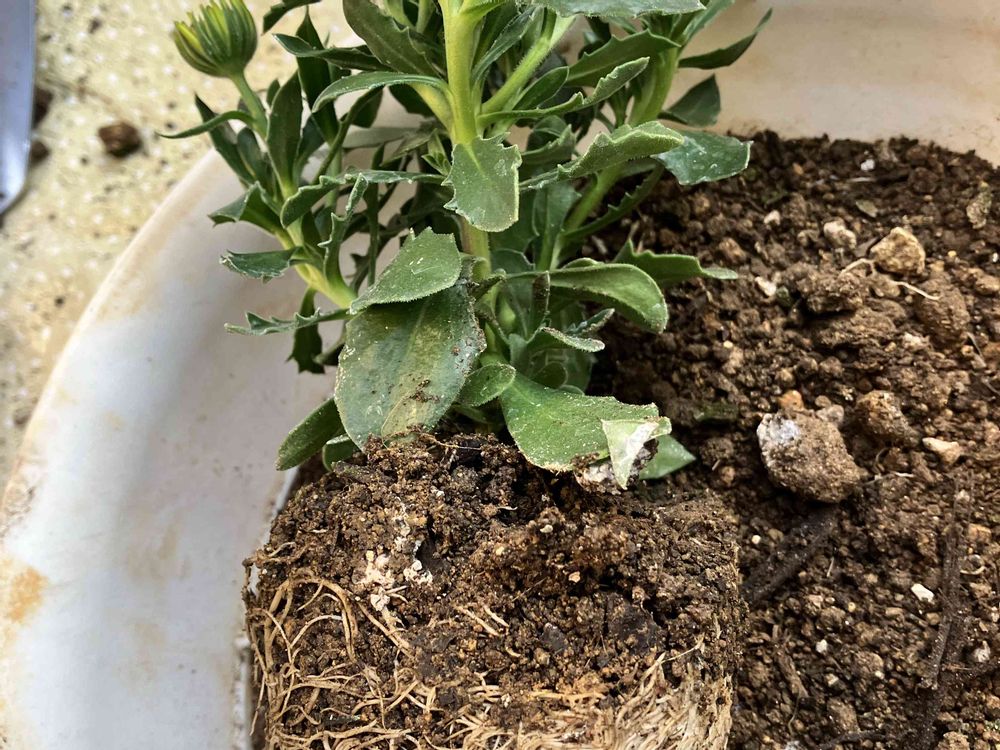 オステオスペルマム、無事に植え替えました💕根っこがグルグルだったので、できるだけ切らないように慎重に根鉢を崩して一回り大きなセリアのスリット鉢に植え付けてみました✨セリアは色々園芸用品が充実しているので、定期的にのぞいてしまいます😂