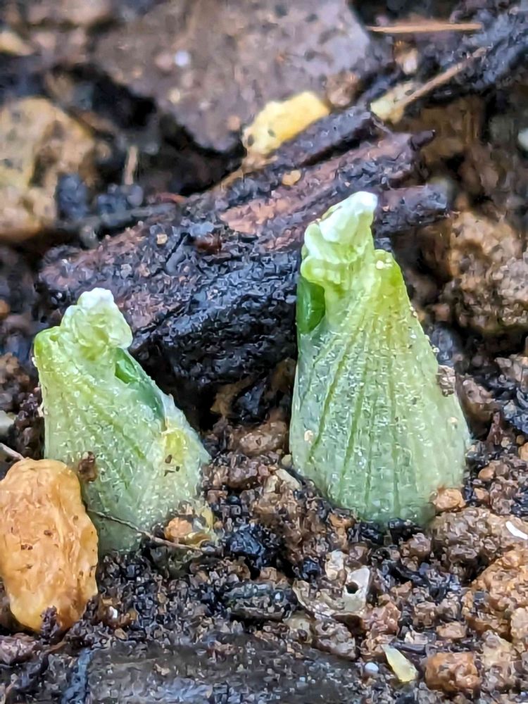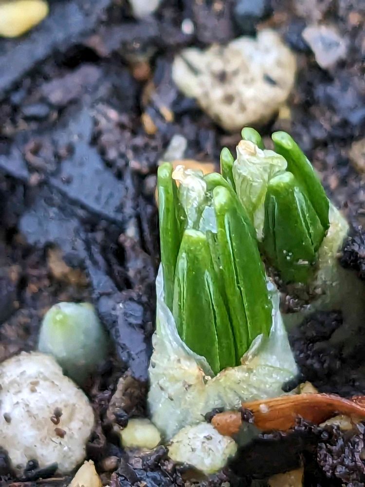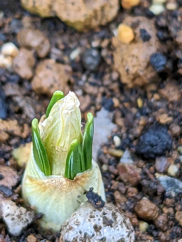 ウチでも白と黄色をひとつづつ芽が出始めています♪原種チューリップ、ムスカリと共に🥰