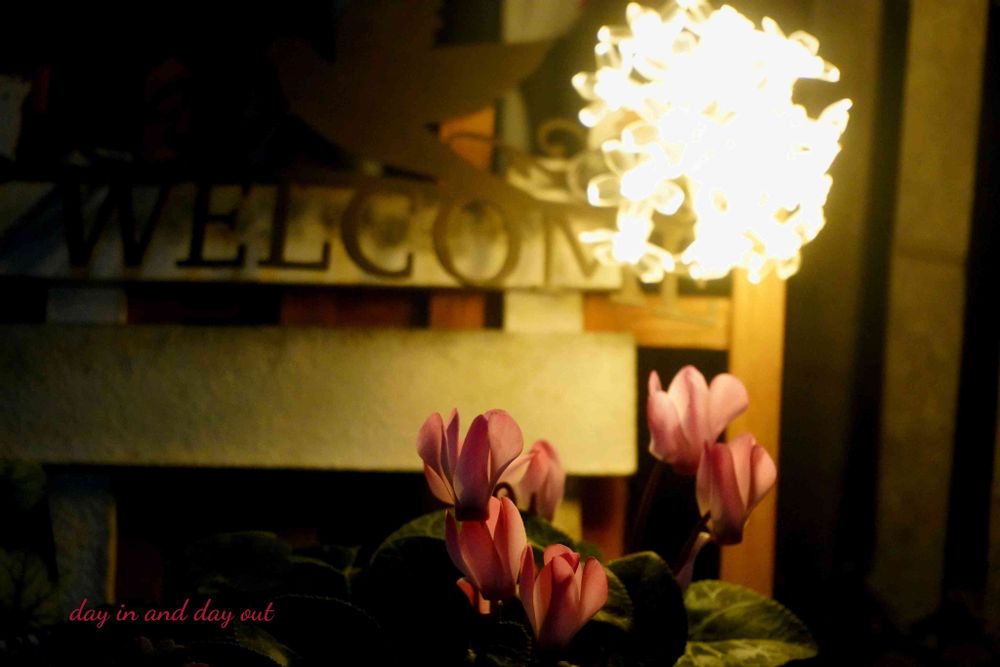 外灯とLEDライトにぼんやり照らされたガーデンシクラメンが綺麗で✨✨✨