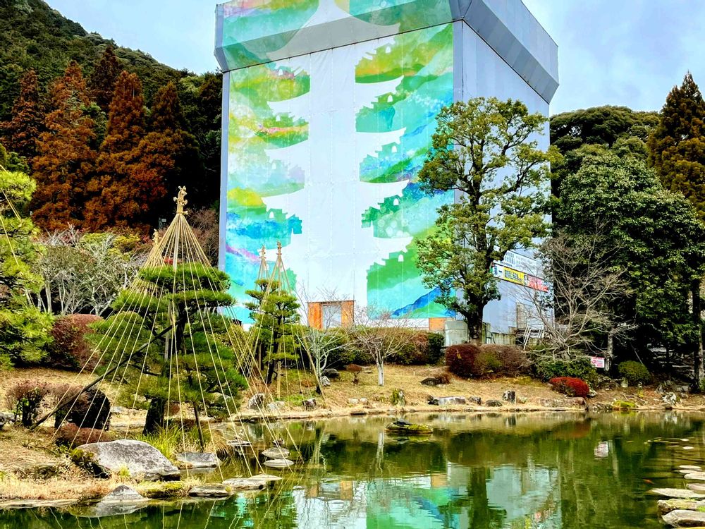 国宝瑠璃光寺の五重塔修復中で囲いがされて五重塔の絵が描かれていました。
