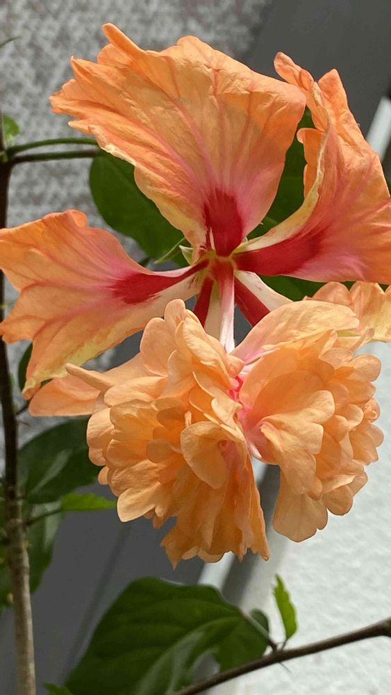 オレンジ色の花弁の中心から濃紅色が入り…二重咲きのハイビスカス🌺フラミンゴ🧡です❣️🧡🌺🧡