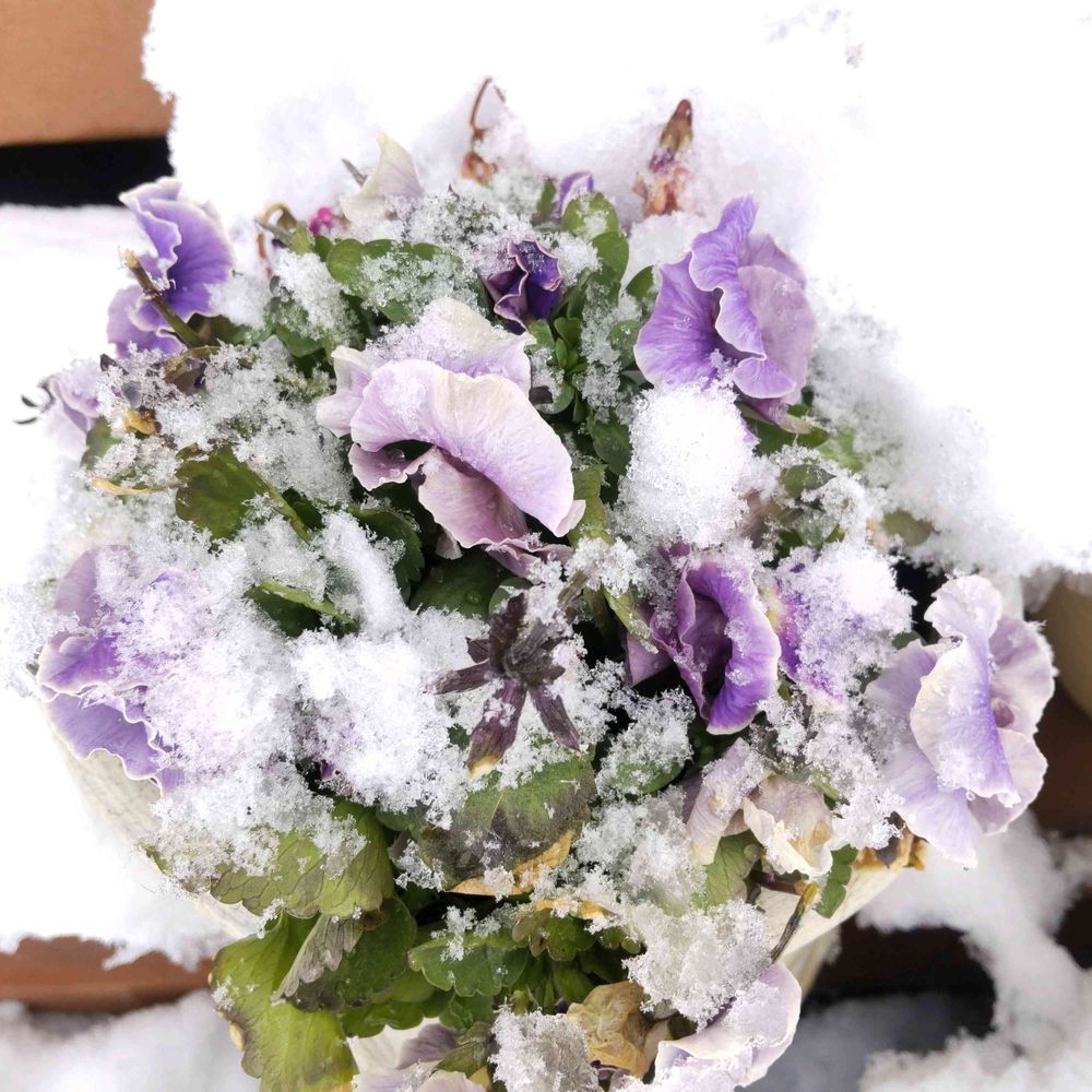 今朝、雪後、ベランダ初めて出ました😊南だから、屋根からの雪もほぼ溶けてました🫠軒下の鉢は乾いてたから、水やりせずに雪のせてみました😅