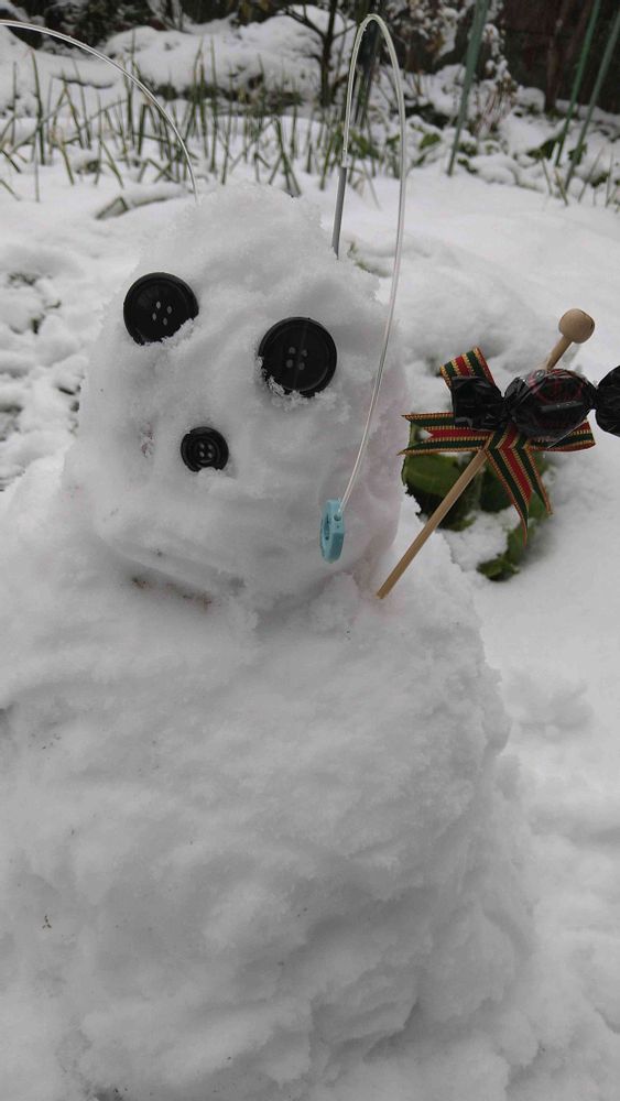 雪だるま☃️作ったのですね🤭目が黒いボタンなので、ちょっと見、パンダ🐼に見えますね☺️私も、積もったら全体作ろうと思いましたが、雨で、ダメでした🙅🙅♀️