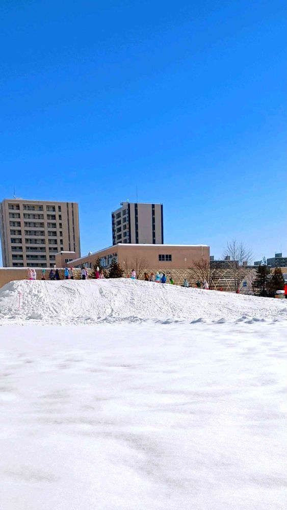 あ、小学校の校庭にスキー練習山が出来ていて、1年生が練習をしていた。