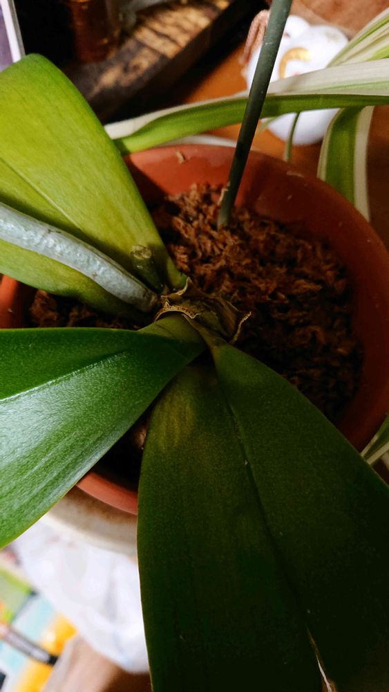 ミディ胡蝶蘭キャンディさん。葉っぱが傾いてきたので、どうしたら良いかわからないですが、茎を根元まで切ってみました。(長い茎で体力使わないように)これで、寿命伸びるといいなぁ。