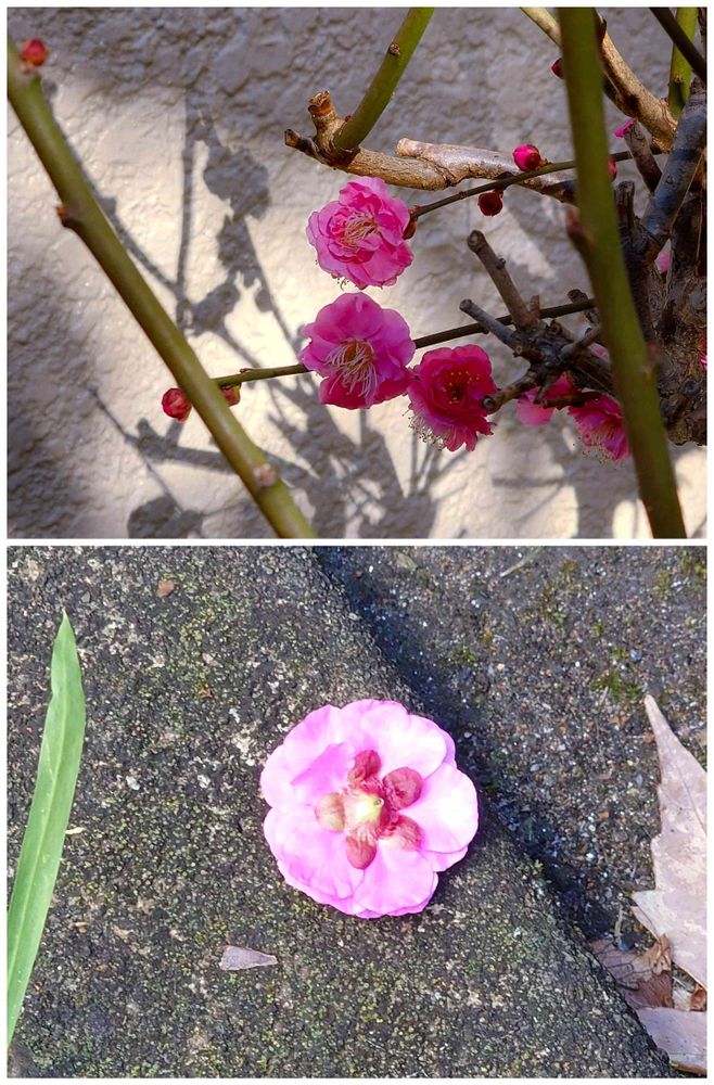 一昨日の風雪で、盆栽の梅の花がたくさん落ちてしましました☹️ 雪が溶けたら、犠牲になった花がそのままの形で出現🧐😮 うれしいような、悲しいような🤔 とりあえず今日は快晴になりそうです☀