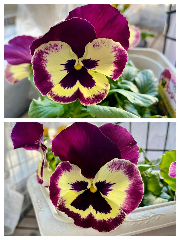 パンジーの、色はラズベリーサプライズです😊ビオラを見慣れてるからか😃花が大きいなあ🥰と思いながら癒されてます🎶