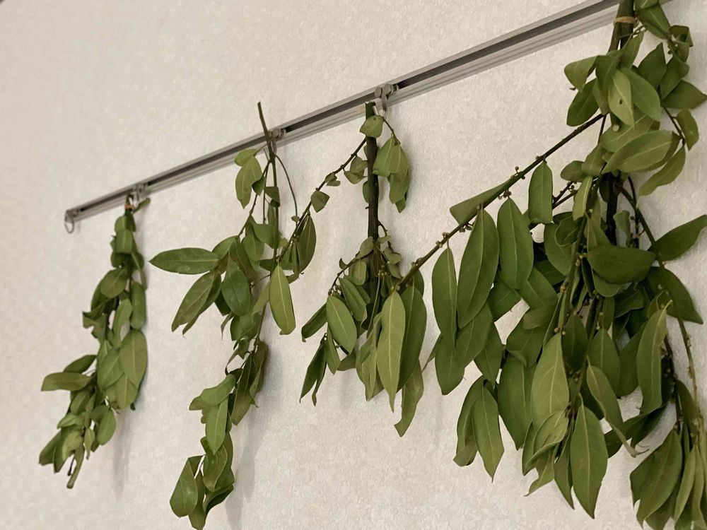 お料理用月桂樹をレールに引っ掛けて乾燥させています🌿ちょっと神棚みたい。。。いい香り