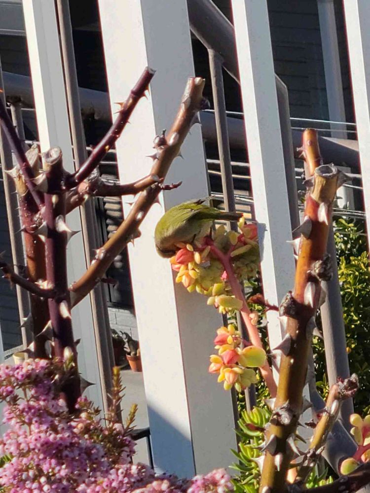 ワォ~わが家のピーチホリディーさんにも今日メジロちゃんが蜜を吸いにきていました😁💕