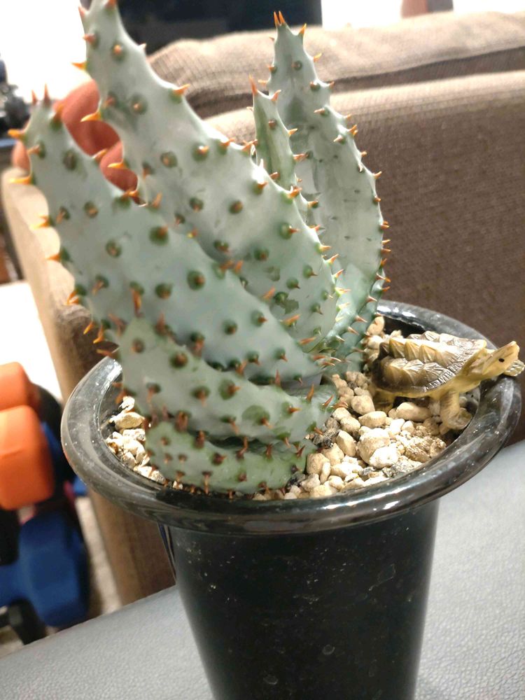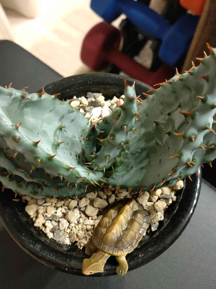 青白い葉を厳つい棘で武装する男前アロエに、背景にはサイズ比較用の多数のダンベルが配置されて‥葉っ⁉️Σ(゚□゚)💦