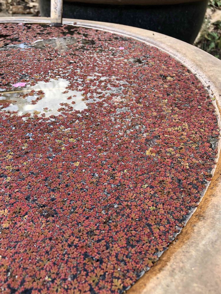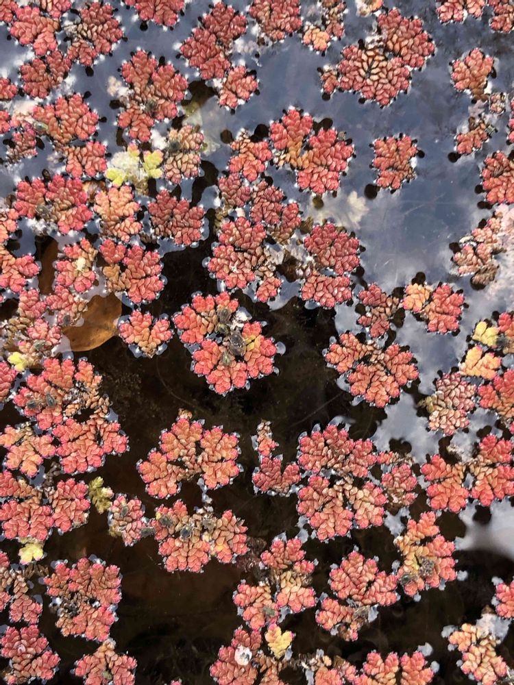 ヒツジグサとかいつもこの鉢で見ていたのですが、この浮き草を見たのは初めてでした。水面が赤くなっていたので近づいてみたらこんなに綺麗な浮き草がいっぱい浮いていました。寒くなると赤くなるそうです。育ててみたくなりました😄