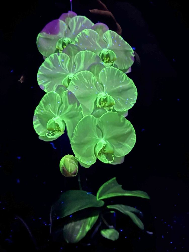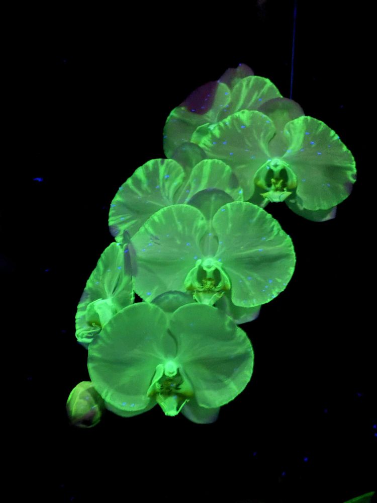 普通の白いコチョウランを暗闇の中で紫外線を照射するブラックライトを当てると花やツボミ、葉が淡い黄緑色に光ります