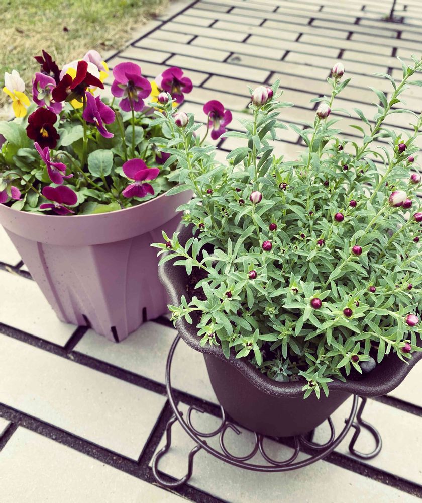 ええっ😳安っ💦😳ビオラ3株と花かんざし、6号のかわいい鉢に植えてあるものが、両方298円❣️花代だけやん😂