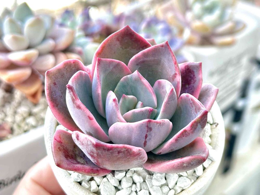 薄葉とも言えない、やや肉厚のピンクが濃くブルーとのグラデーション覆輪斑がキレイな『ピンクハリン錦』です(∩˘ω˘∩ )♡溺愛