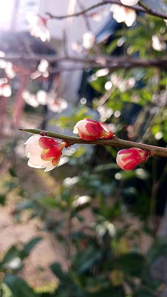 梅の花 春の知らせを告げている ぷっくり蕾 夕陽に光る