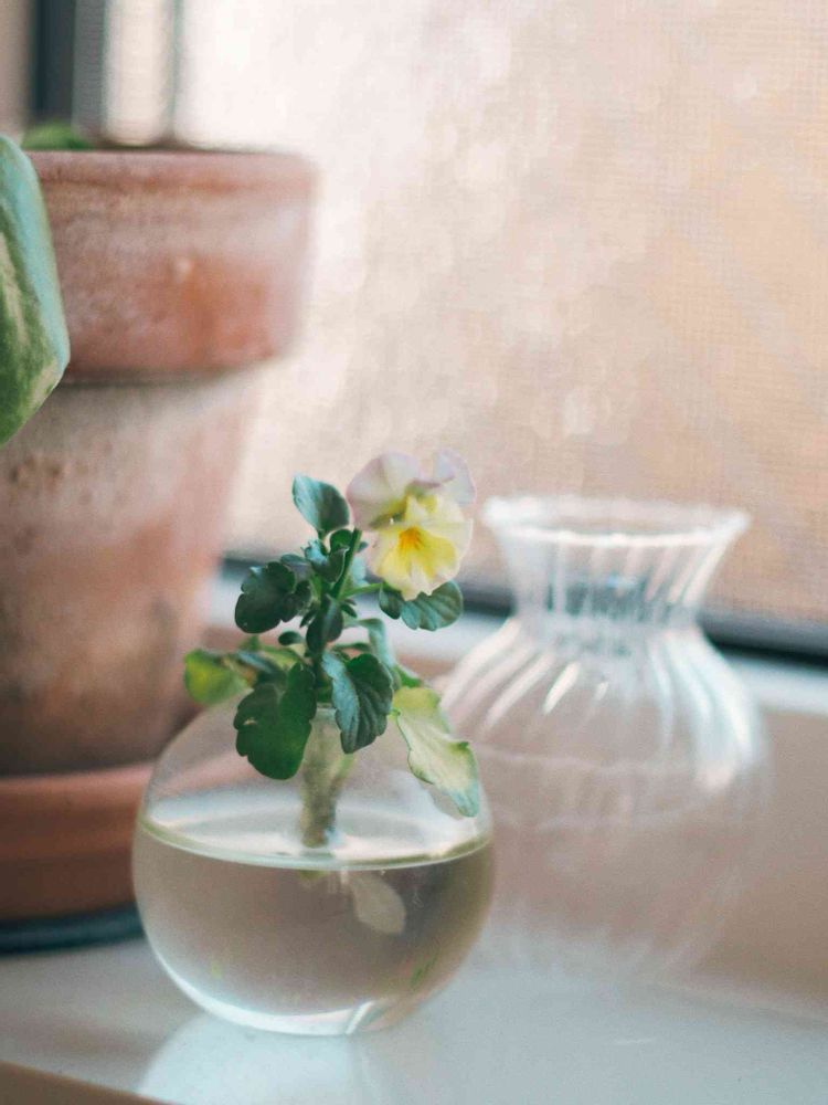 庭いじり中にひっかけてしまったフリフリビオラさんの葉を窓辺に飾っていたのだけど、気付かぬうちに花を咲かせていた…!!可愛い!!癒しをありがとう🥰