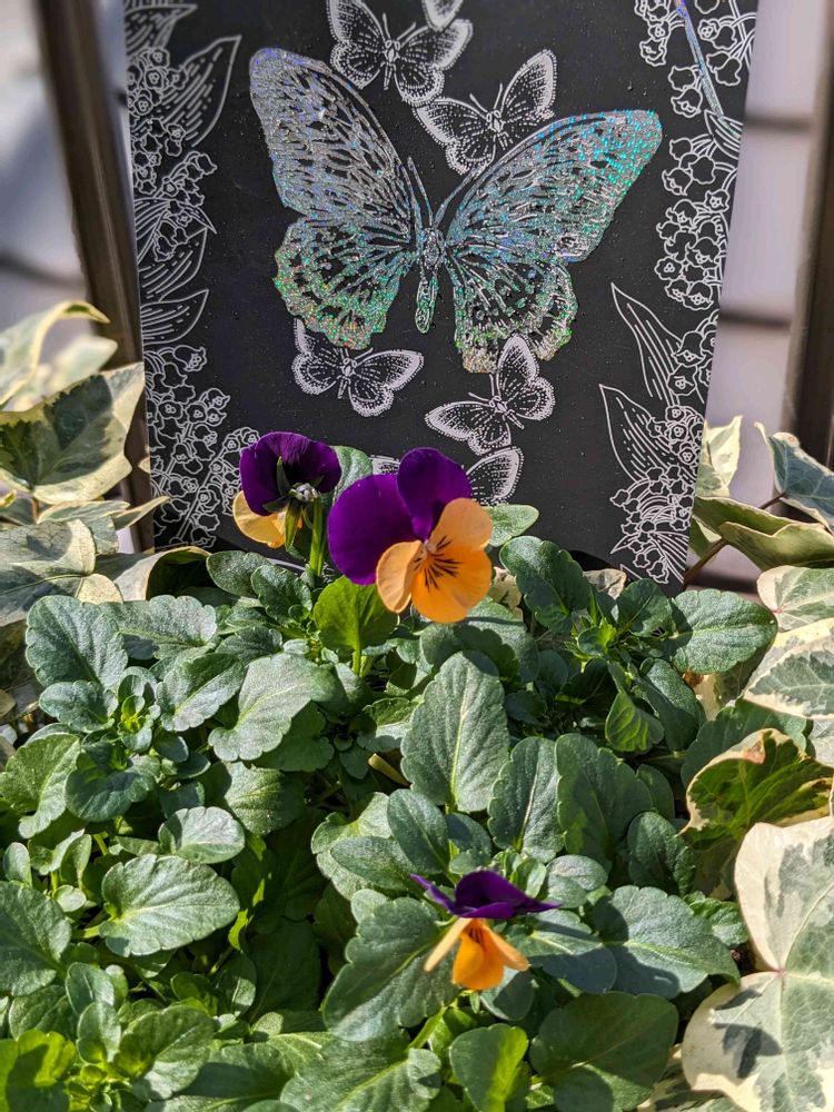 やっと咲いたビオラチャン❣️にょろにょろチャンが過保護にワンツーマンで見守り中👀🔍