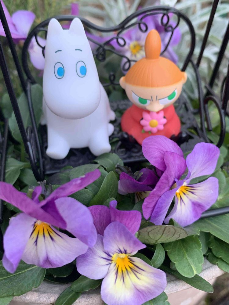 仲良くパンジーさん見ながらブランコに乗っているムーミンとミィで参加させてください🩷ミィ、笑って笑って🩷シャイなんだからー😄