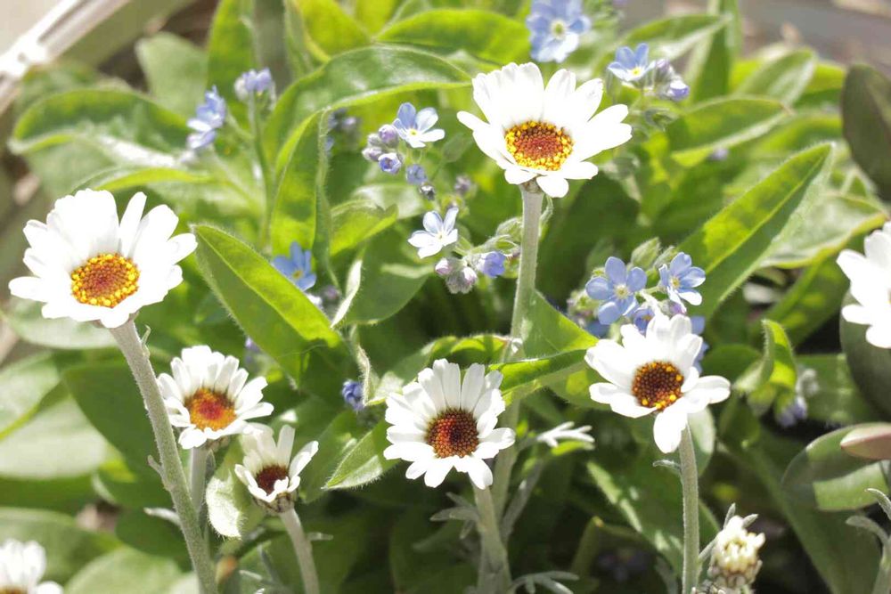 ポット苗を買ってカゴに入れたままになっているローダンセマムと勿忘草