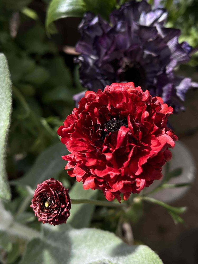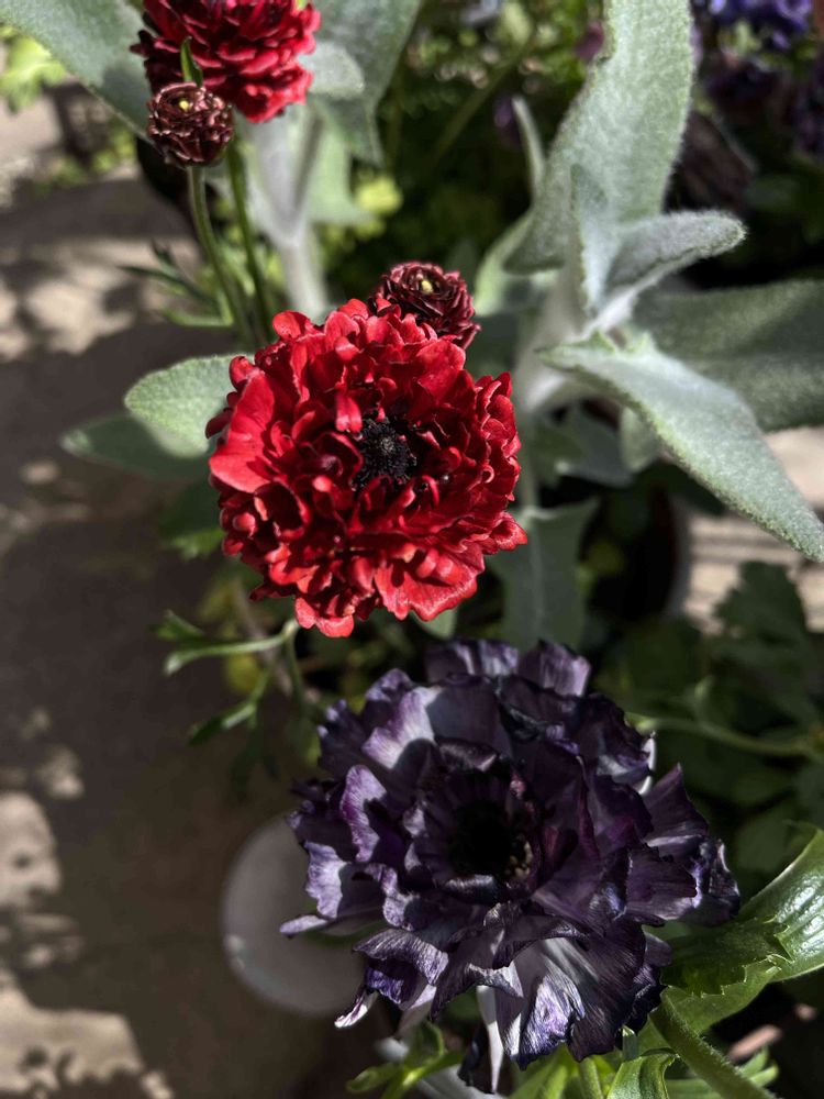 ラナンキュラス ルージュルージュ♥️♥️赤い色は正直少し苦手だけど、このルージュルージュの色は惹かれます(((o(*゚▽゚*)o)))♡💕❷イカロスパープルの紫色…ほぼ黒と言って良いのでは…?❸カナリエンシスランスロットのモフモフの葉っぱと良く映ります👍