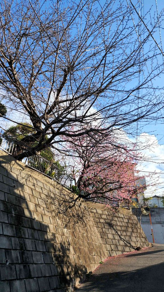 フユザクラの隣のカワズザクラは、いつも遅れて咲きます。