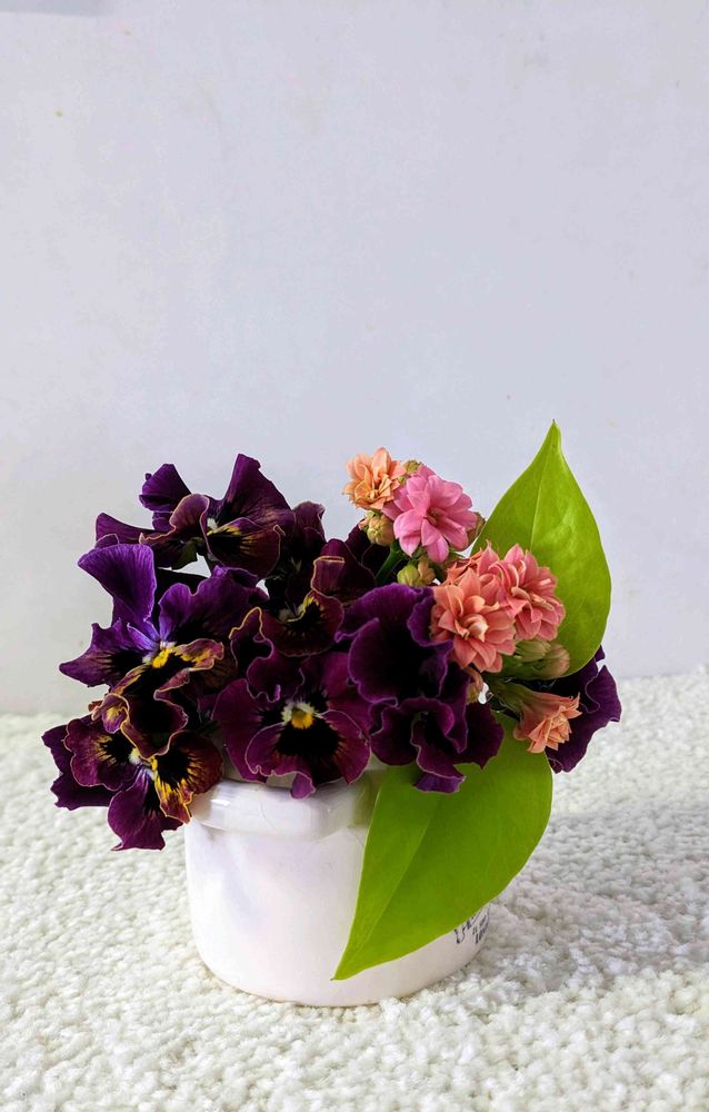 ビオラがシックな紫色💜でしたので明るいカランコエのお花💗🧡で華やかさを足して更にライムポトスを入れたら雰囲気が良くまとまりました💚