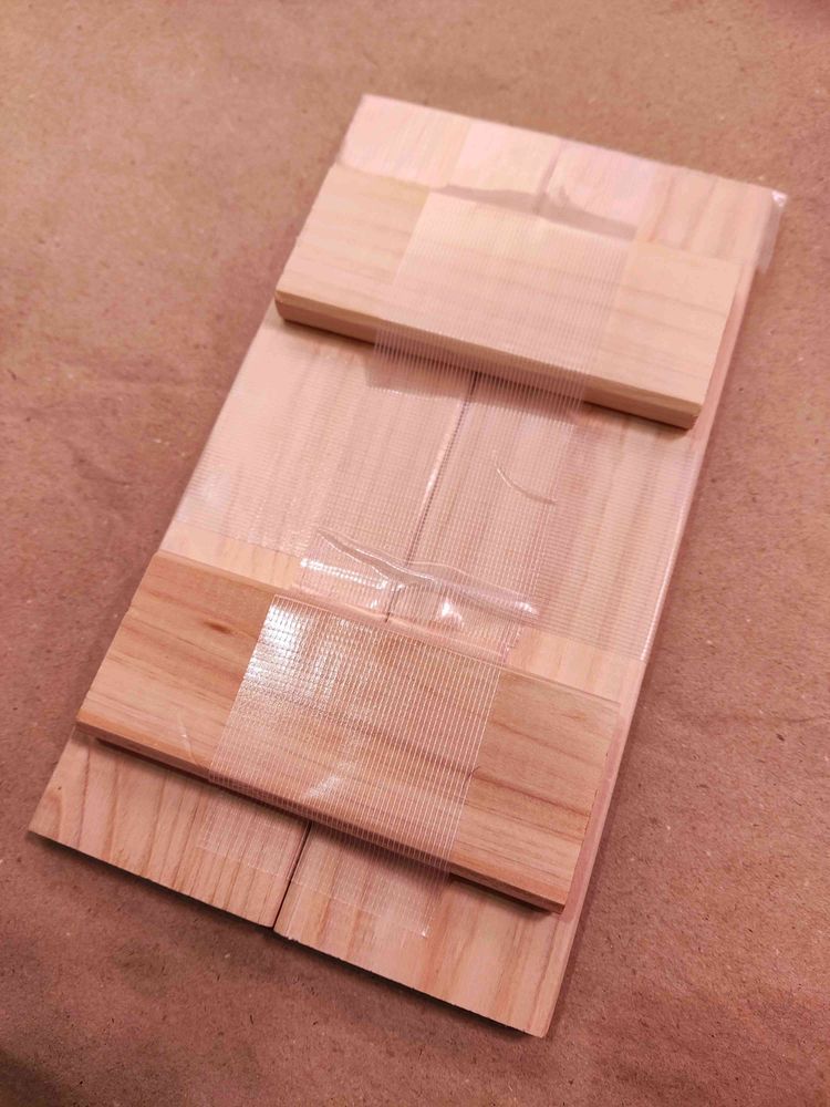 1枚板だと反ったり割れたりするのも嫌なので細いヒノキを2枚連結して作ります。