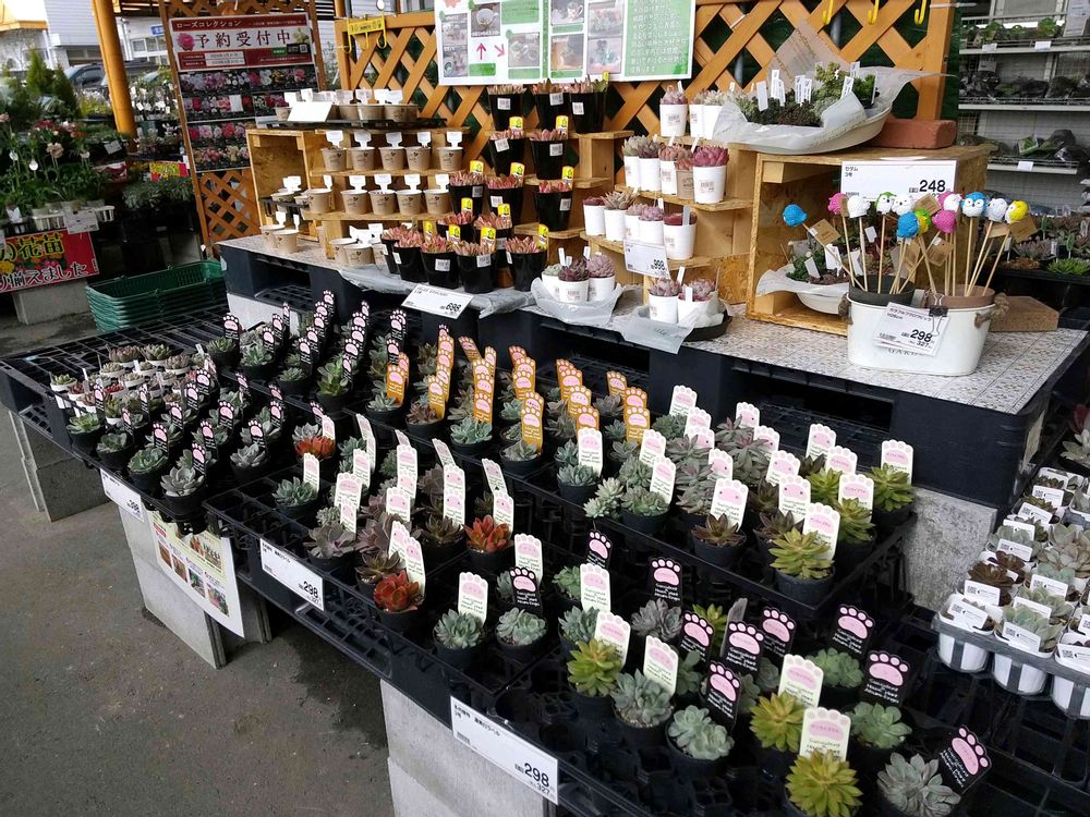 初めてです。こんなにたくさん多肉が置いてある。目の保養効果大。ドルチェ苗も。