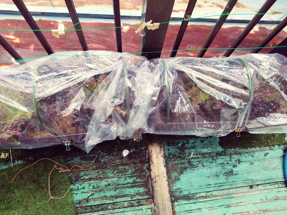 4株とも順調に生育しています。透明のゴミ袋をかっとして無理やりカバーを作りました😅