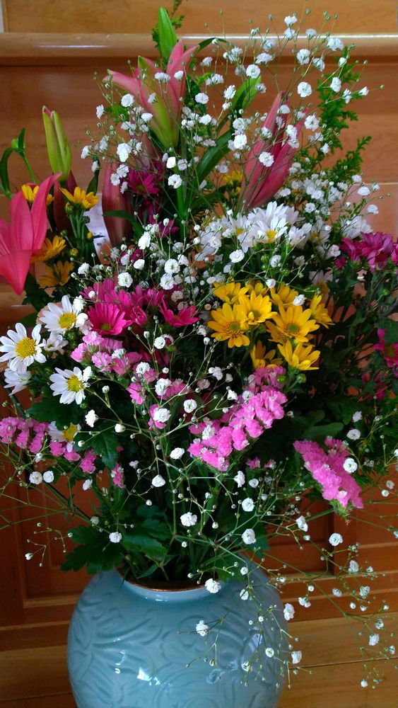 💐ユリ・小菊(白 黄 ピンク)・スターチス・カスミソウ💐