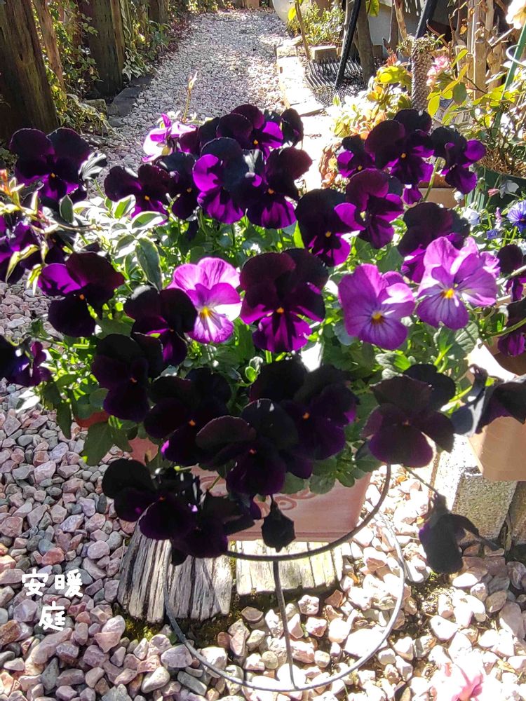 2 生産農家さんで買った黒いビオラと種まきのビビ・アンティークの寄せ植え。
