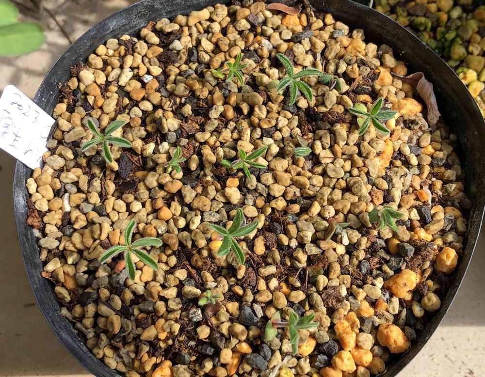 種蒔きしたオキザリス・ヒルタです🌱。本葉が5枚なのが面白いです。