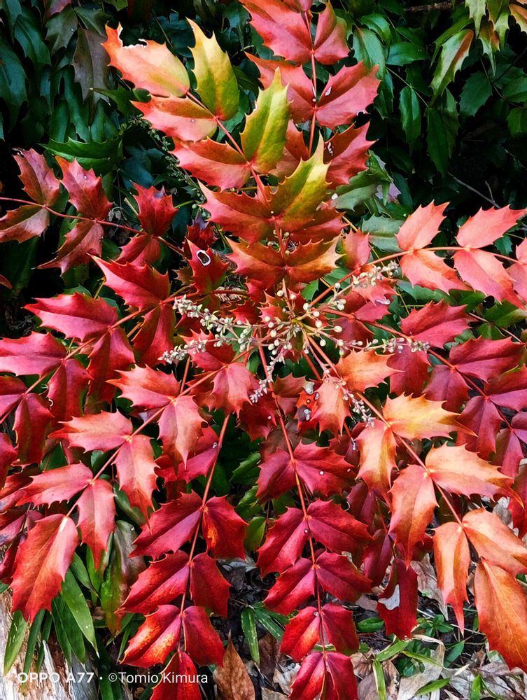 散歩道のヒイラギ南天綺麗なグラデーションを放っています。