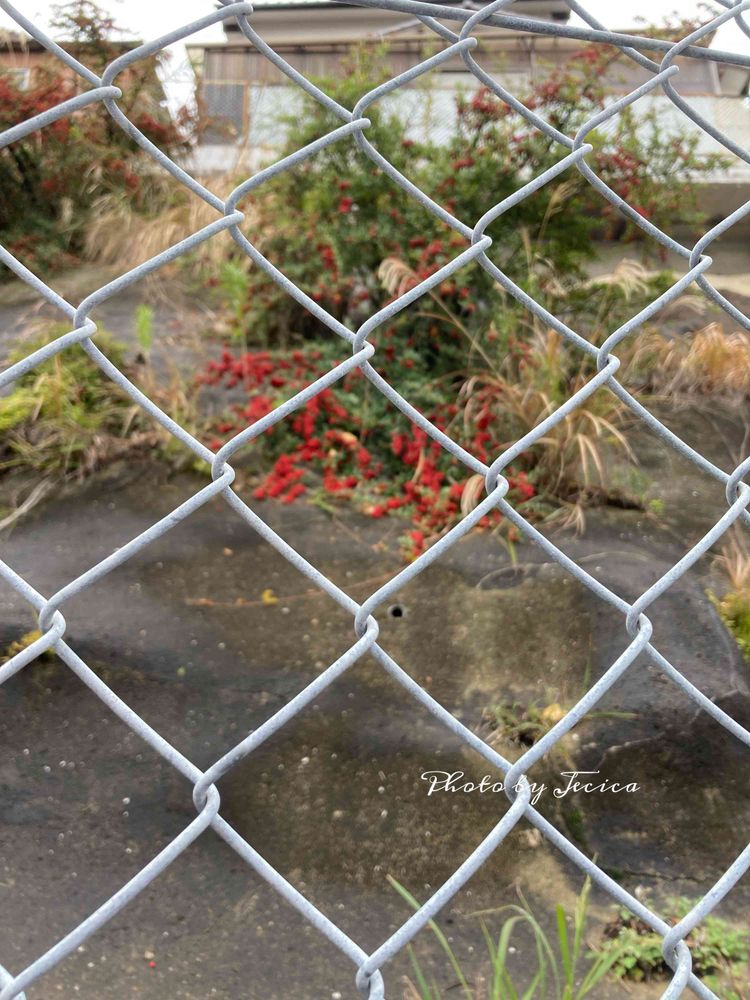 ネットのフェンスの中に真っ赤な実がいっぱいなってて