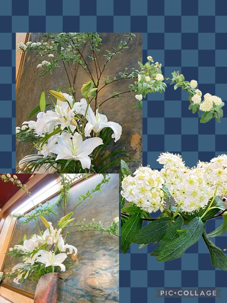 ③オリエンタルリリーとコデマリが存在感のある素敵な花瓶に生けてありました。
