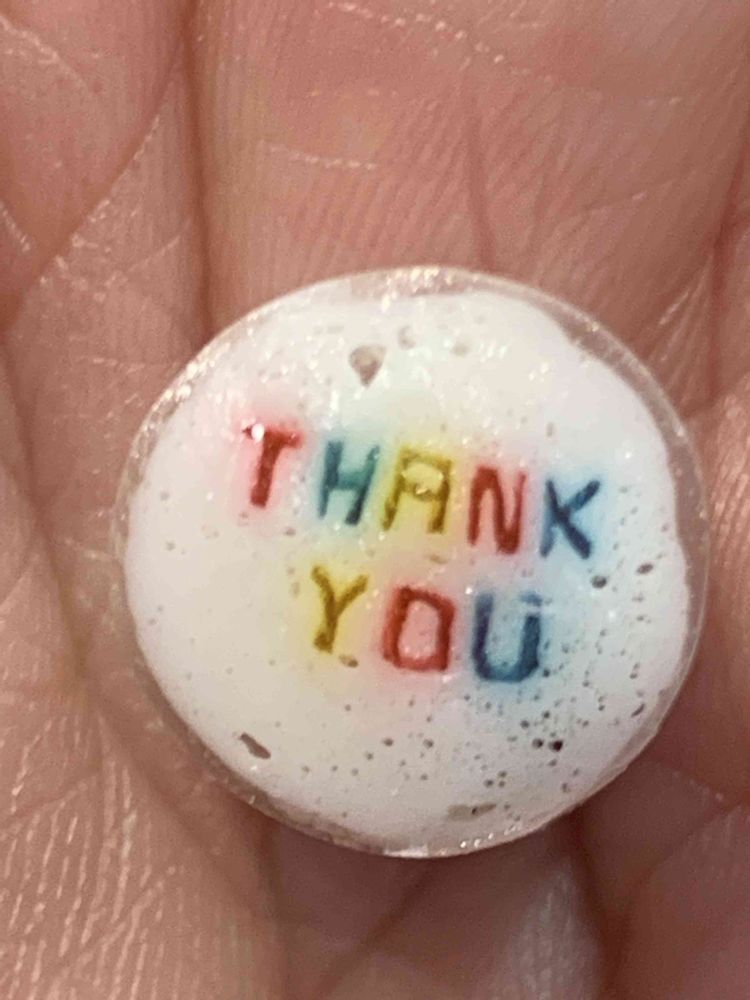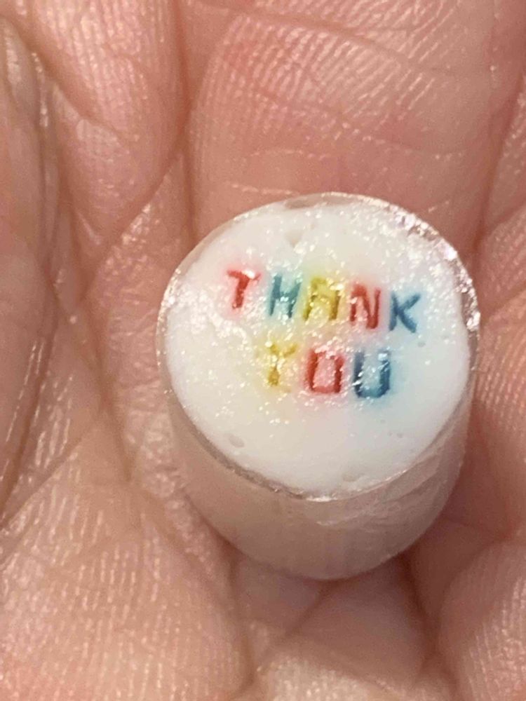 出来上がった飴はホワイトデーにピッタリのありがとうの飴でした。