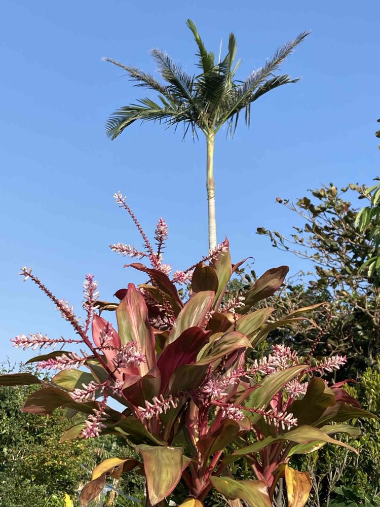 コルジリネ🌿の花芽(蕾)がいっぱい、後方には何ヤシ🌴でしょうか🤔青空に映えてます❣️