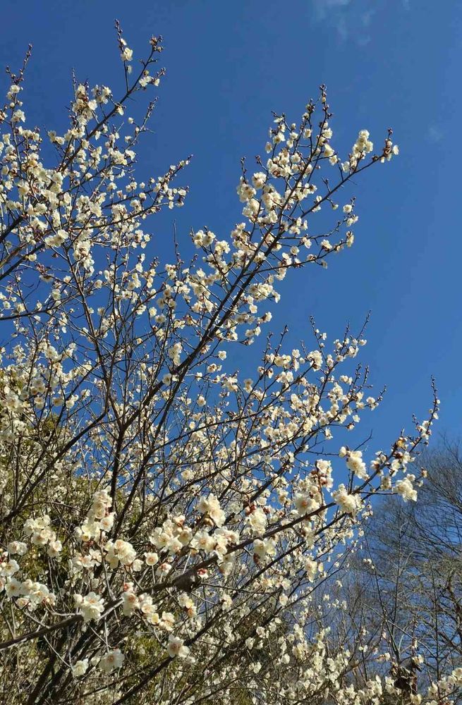 バラ科サクラ属の落葉高木。奈良時代の少し前に中国から渡来した。中国中部原産で古くから栽培されていた。庭や畑で栽培されるが、時に暖地で野生化している。花期は2~3月、春の花の先駆けとして寒中に咲く。 花の香りがよいのは成虫で越冬するハナアブなどを呼ぶため。メジロも蜜を吸いに群れで訪れ花粉を運ぶ。梅には花を鑑賞する『花梅』と果実を採るための『実梅』に分けられる。花梅には多くの園芸品種があり、紅梅や八重咲き、枝垂れなどを植えているのは梅園で、白花ばかりが咲き揃うのは果実を収穫するための梅林。また、梅には600種類以上の品種があるといわれるが、野梅系(やばいけい💬原種に近く果実が小さめ➡️甲州野梅、白加賀など)、緋梅系(ひばいけい💬枝の中の髄が紅色をしている。多くは紅花だが、たとえ白花でも枝を折って赤い材なら緋梅系➡️寒紅梅、鹿児島紅、唐梅など)、豊後系(ふんごけい💬アンズとの自然雑種で果実が大きい➡️南高、竜峡小梅など)の3つに大別できる。