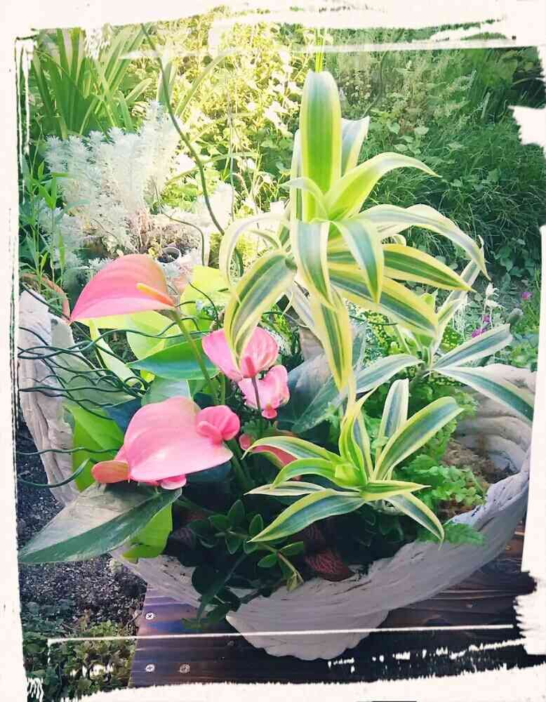 観葉植物でやるって珍しい気がするっ。アンスリウムのピンクが映えてるね😄