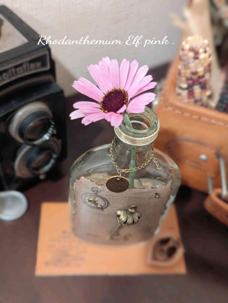 p,① 昨日お迎えしたローダンセマム エルフピンクさんを植え付け後、今咲いてる子をcutෆ˚*手作りの一輪挿しに。